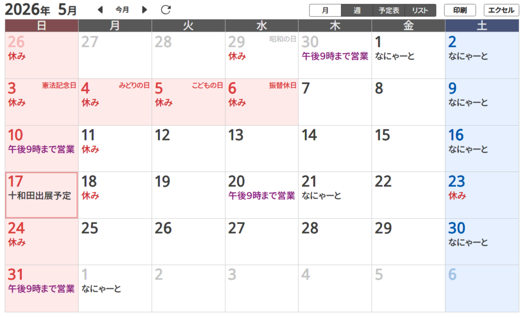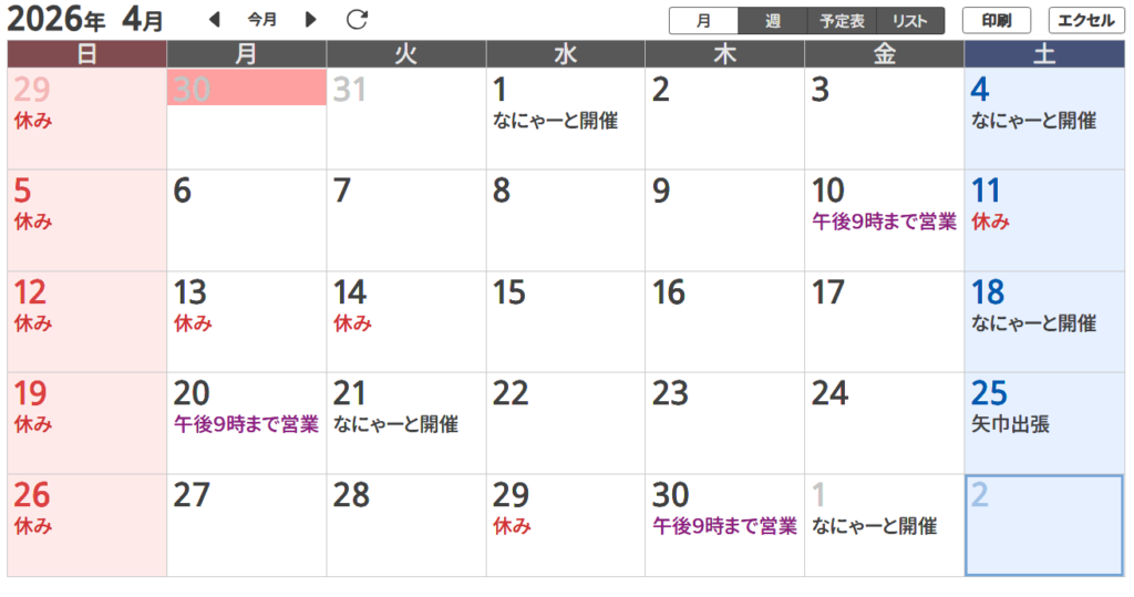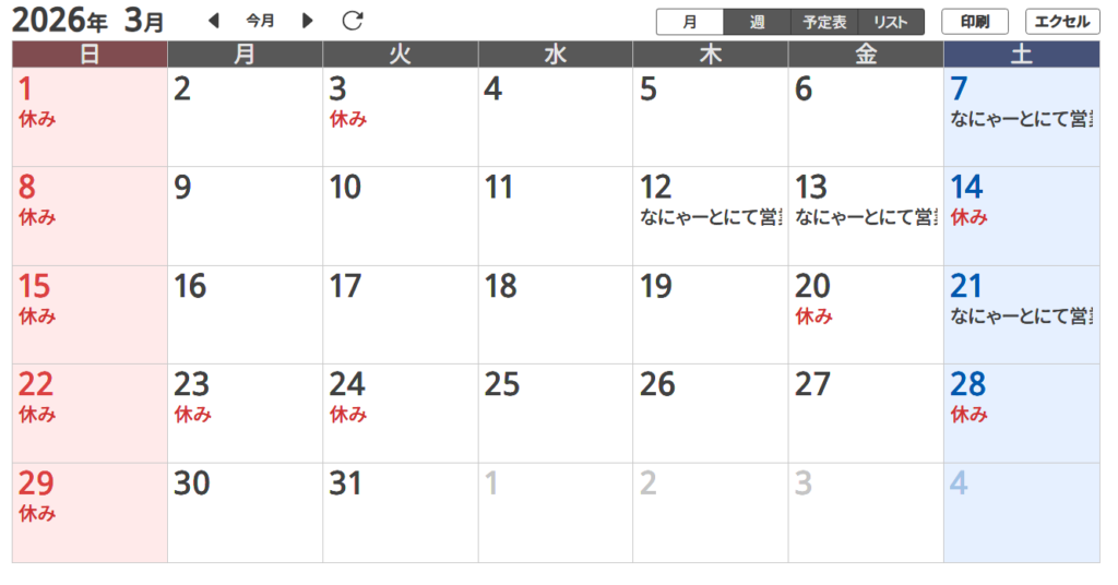 営業日カレンダー
